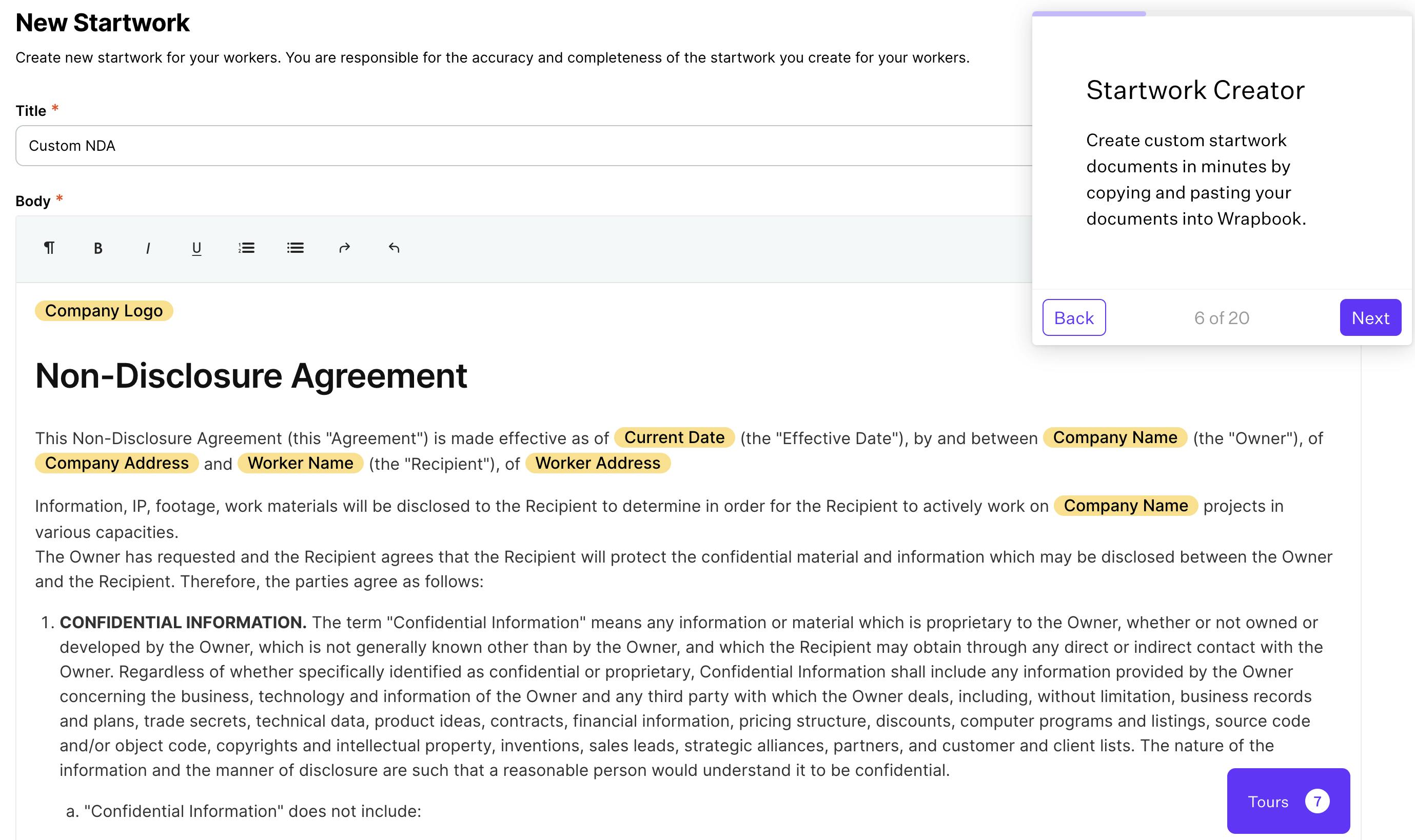 Digital startwork: Employers can create and send custom startwork, such as I-9s, W-4s, NDAs, and other fillable PDFS, within Wrapbook. Signatures are collected electronically in compliance with SOC-2.