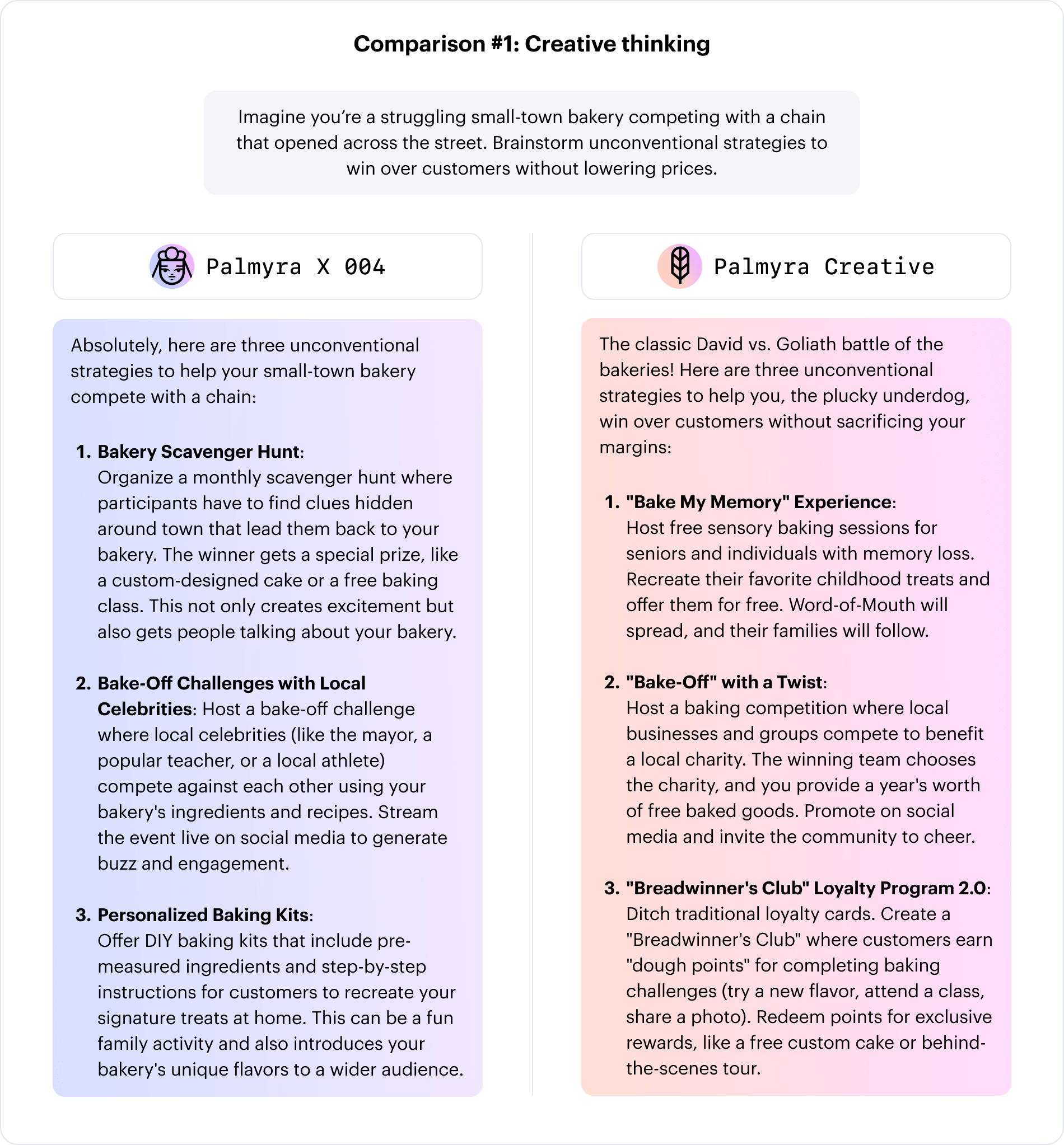 Palmyra Creative is built for creative and consumer-focused applications. Featuring a context length of 131K tokens and 122 billion parameters, it transforms basic prompts into impactful narratives for marketing, corporate communications, or technical content. This LLM helps retailers create personalized campaigns, finance teams build educational tools, and healthcare organizations produce targeted outreach, all with high-quality output.