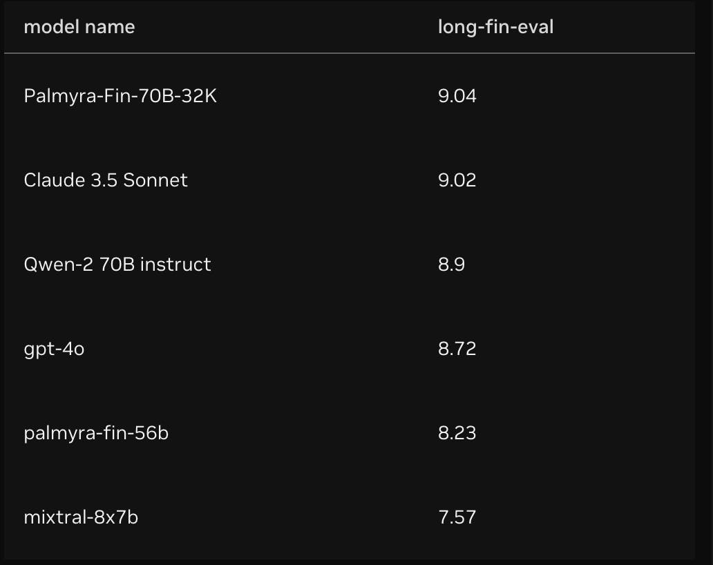 Palmyra Fin caters specifically to the financial sector, providing expert-level analysis, reporting, and data processing. It passed the CFA Level III exam with a 73% score — a significant jump over the usual 60% passing threshold — and considerably outperformed GPT-4’s 33% as of April 2025. In real-world tasks like long-fin-eval, which test a model’s ability to handle complex, multi-step financial reasoning, Palmyra Fin also surpassed several leading models. Equipped with a 32K token window (approximately 33K tokens), it also achieved 100% accuracy on needle-in-haystack tasks, where the model must find a specific piece of information hidden in long financial documents, demonstrating strong retrieval capabilities.