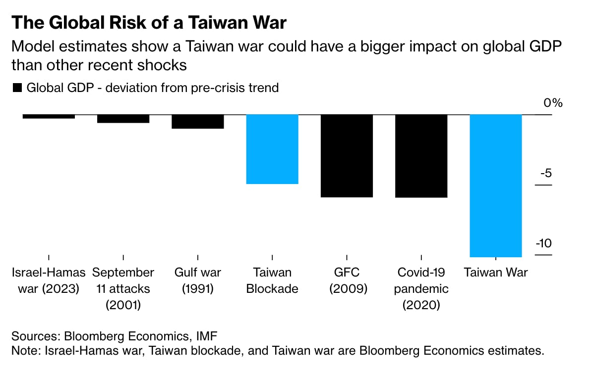 To quantify its economic importance, a large-scale conflict over Taiwan and the resulting shutdown of Taiwan Semiconductor Manufacturing Company (TSMC) could result in an estimated $10 trillion global economic collapse and wipe out 10% of global GDP overnight.