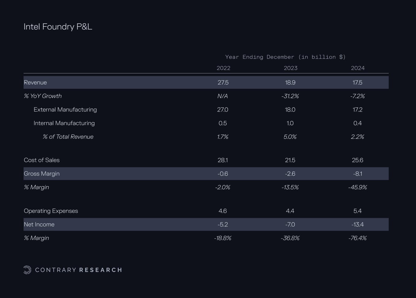 Intel’s decision to start breaking out the Intel Foundry P&L in October 2022 was an important step in providing context on the business. But it isn’t a pretty picture. Declining revenue, worsening gross margins, and growing net losses. Intel Foundry’s losses contributed to the first overall profit loss for Intel since 1986. In addition, the financial picture led to multiple class action lawsuits against Intel executives, accusing them of misleading investors about the health of the business.