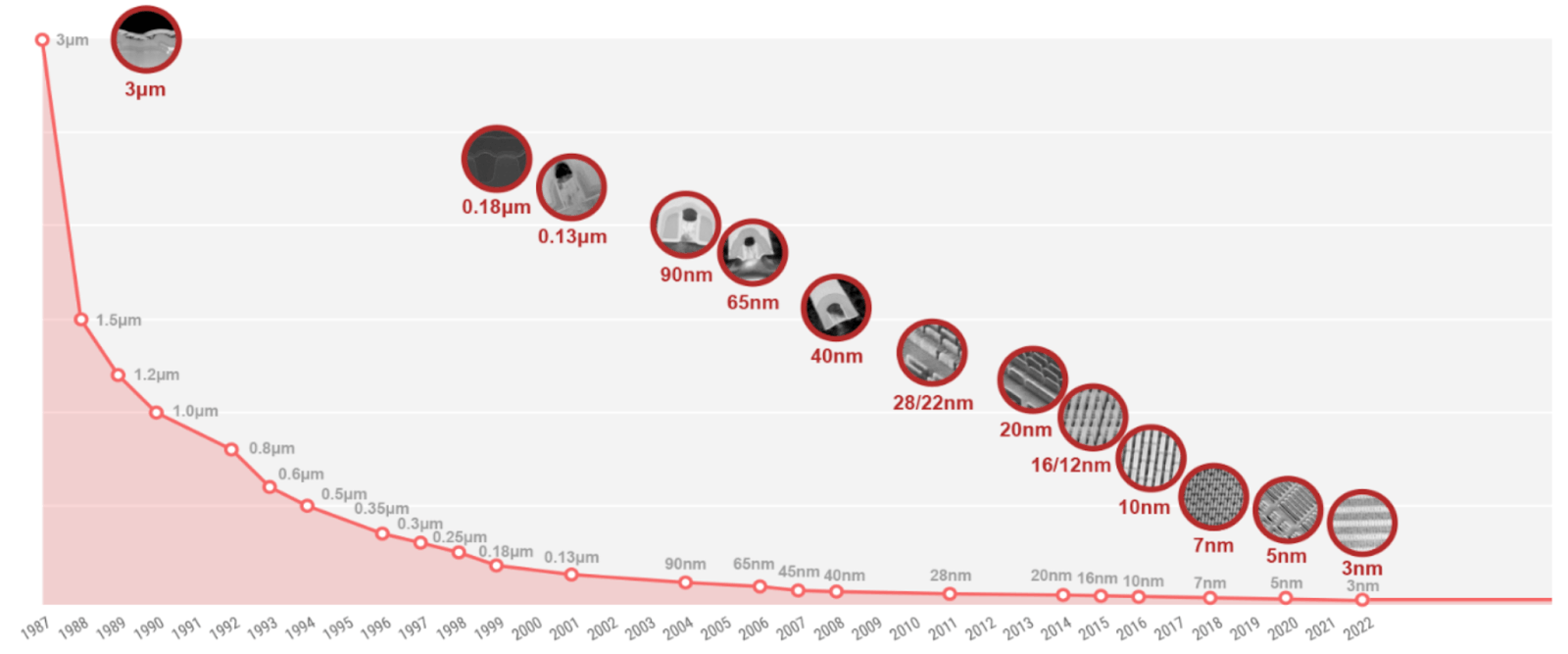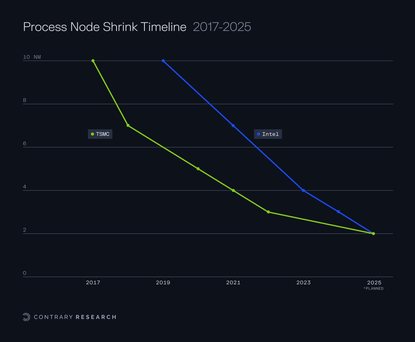 Rapid Improvement: The quintessential framework in the semiconductor industry is Moore’s Law, the prediction in 1965 by Gordon Moore that every year the number of transistors in an integrated circuit would double (revised to every two years in 1975). That rate of improvement held true until 2016. While that rate may not be doubling every two years, the rate of progress is still meaningfully fast. Companies like TSMC and Intel have plans for the production of 2nm and 1nm chips in 2025 and 2027, respectively.