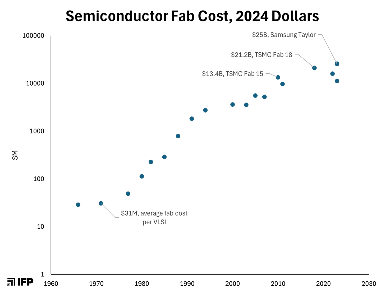 Just as Grove had feared in 2010, the pursuit of economic efficiency ultimately locked America’s chip companies “out of tomorrow’s emerging industry.” The continuous cycle of rapid adoption and technological improvements gave birth to Moore's Second Law, also known as Rock's Law (named after Arthur Rock, who first proposed this principle). The idea was that the cost of semiconductor fabs would double every four years. That has played out accurately, with the cost of a semiconductor fab rising from $31 million in the 1970s (adjusted to 2024 dollars) to at least $32 billion today; doubling in cost every five years.