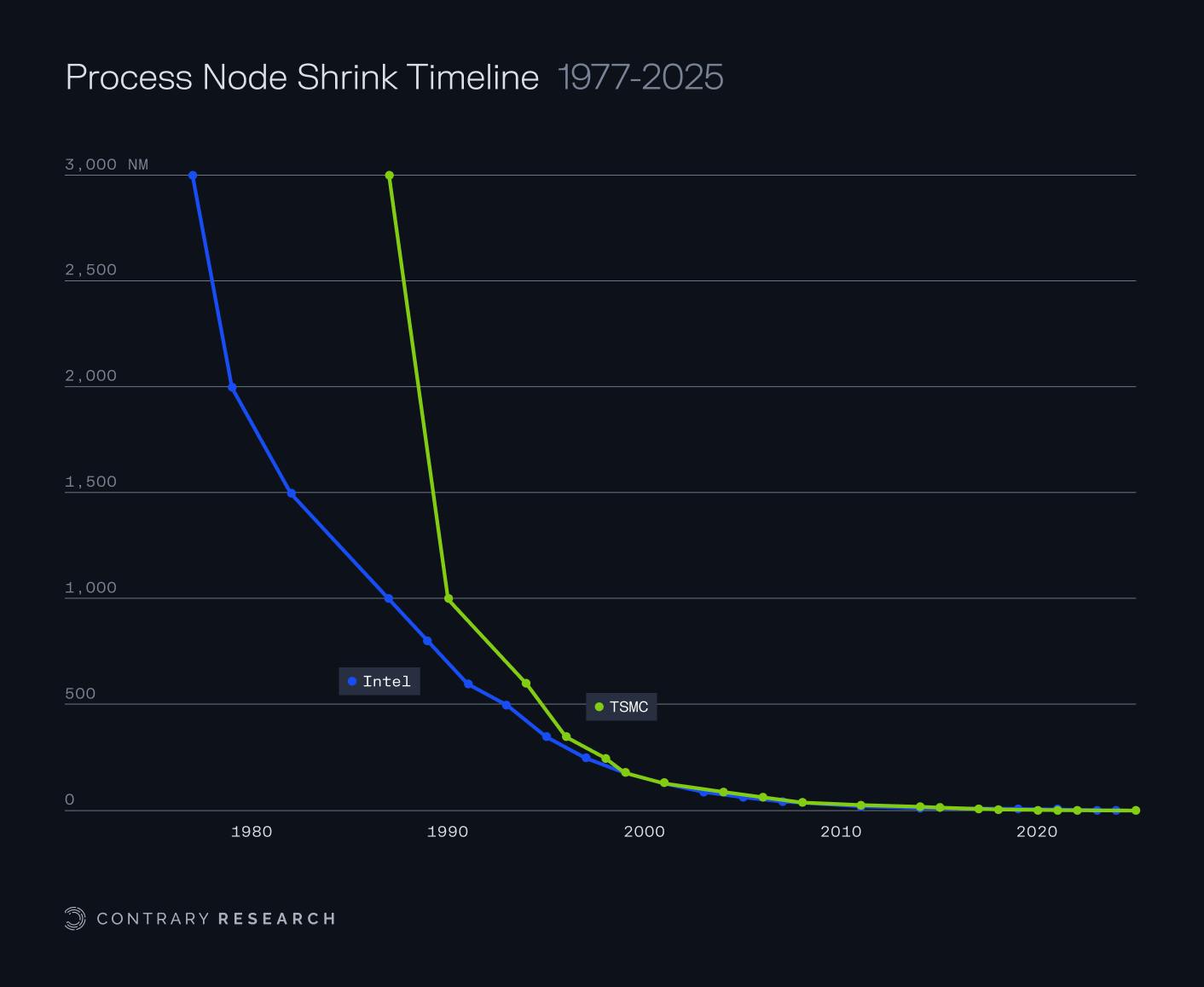 Each American semiconductor company originally built its own semiconductor fabrication plants (also known as foundries) in the US. In the 1990s, Jerry Sanders declared boastfully, “real men have fabs.” But over time, foundry buildout slowed and eventually reversed, as it grew increasingly unfeasible to maintain foundries due to the pressure of exponential adoption and rapid miniaturization. As the market matured, only the largest semiconductor companies could sustain leading internal foundries. Today, Intel remains the only American company that maintains a leading-edge foundry on American soil.