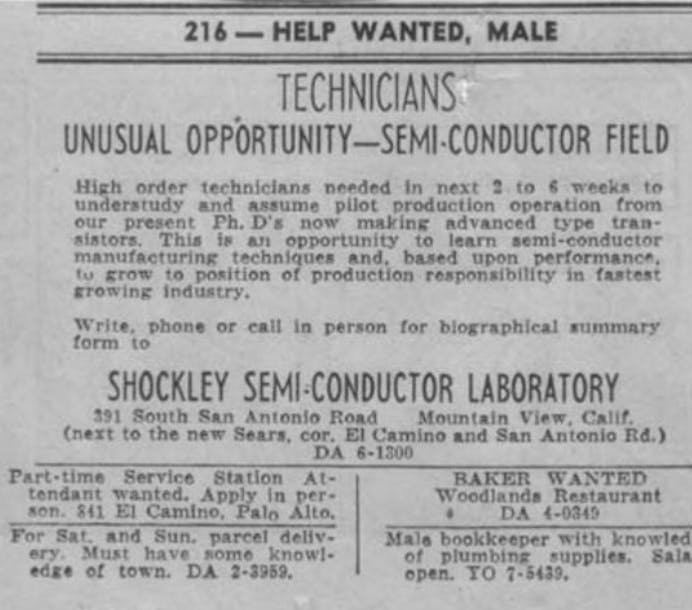 Shockley placed an ad in the New York Times and Palo Alto Times. Out of approximately 300 responses, Shockley narrowed it down to 32 employees by September 1956. Some of the people who responded to the ad included Jay Last, a former intern at Shockley’s early investor, Beckman Instruments; Gordon Moore, a Ph.D. from MIT and Johns Hopkins; Robert Noyce, from Philco; Victor Grinich from Stanford, and Sheldon Roberts from Dow Chemical. Others were recruited by Shockley directly, including Julius Blank and Eugene Kleiner, from Western Electric, a Bell Labs sister company, and Jean Hoerni from Caltech.