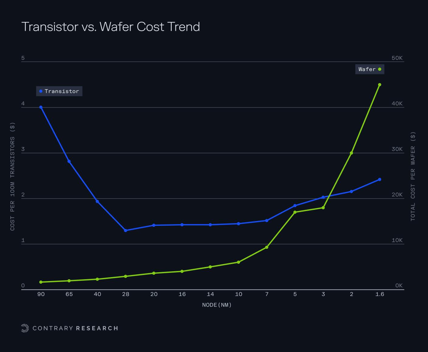 From EUV machines costing $350 million each to novel three-dimensional transistor structures that require atomic precision, total wafer costs have exploded from roughly $2.9K at the 28nm economic optimum to a rumored $45K for TSMC’s latest 1.6nm node. Unfortunately, exponential cost scaling has outpaced logarithmic density improvements. Moore’s law, at least in the economic sense, has already died. The pursuit remains now in technological progress, which is slowing down as well.