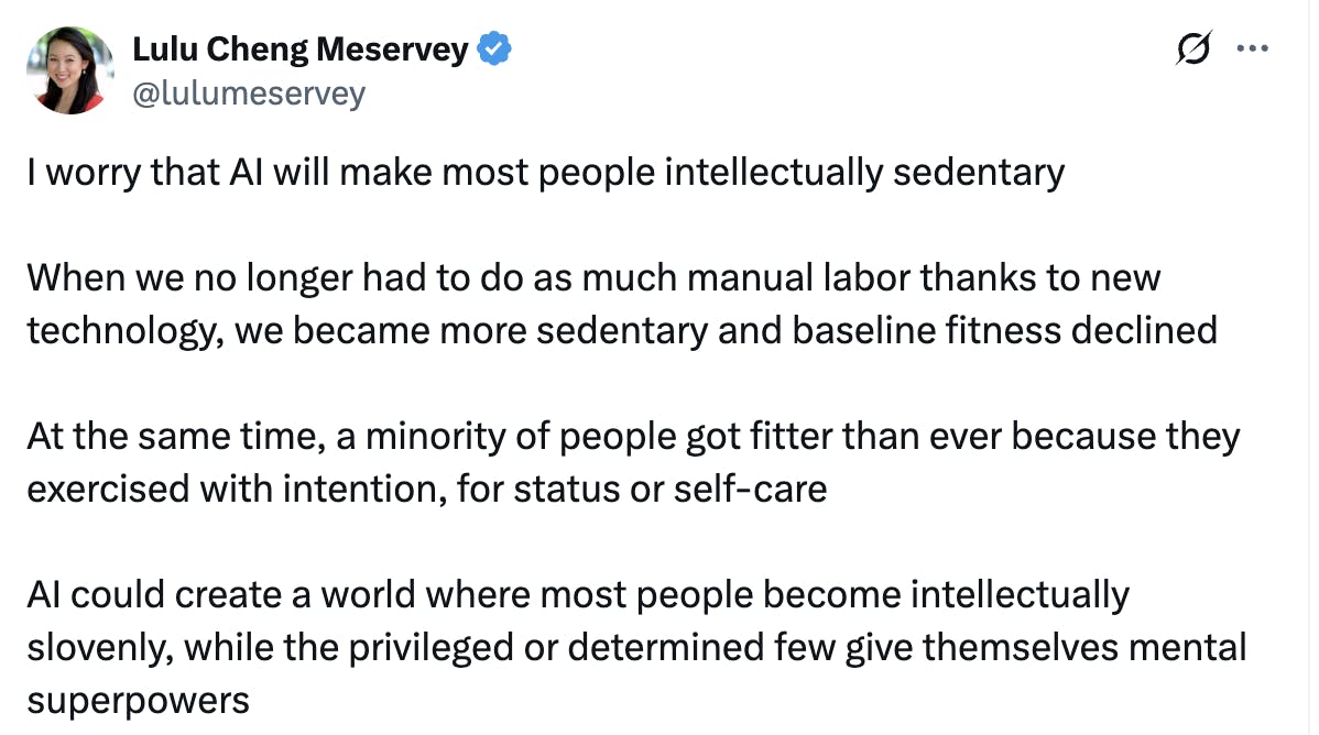 It's easy to imagine a world in which students are outsourcing too much of their thinking to AI, becoming overly dependent on it, and resulting in atrophied reasoning and critical thinking skills. Some worry about AI making people “intellectually sedentary” and harming their mental fitness just like the decline of manual labor after the industrial revolution made people more sedentary, reducing average physical fitness.
