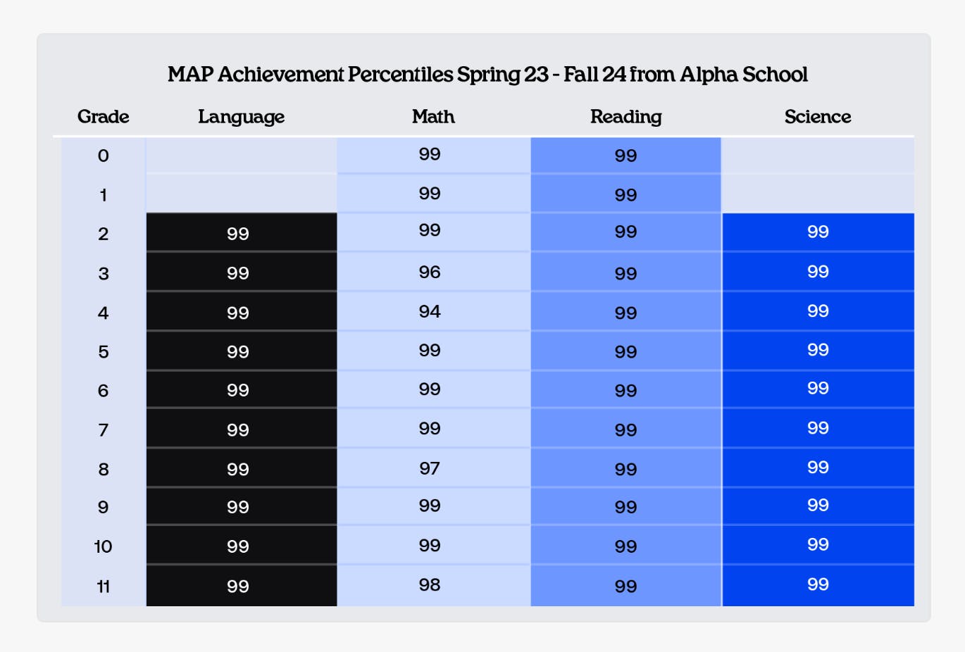 Alpha School claims its students are usually in the top 1-2% for their grade. In addition, Alpha School claims its students improve 2.6x faster than their peers on nationally normed MAP tests, which measure student progress throughout the year compared to where they began.