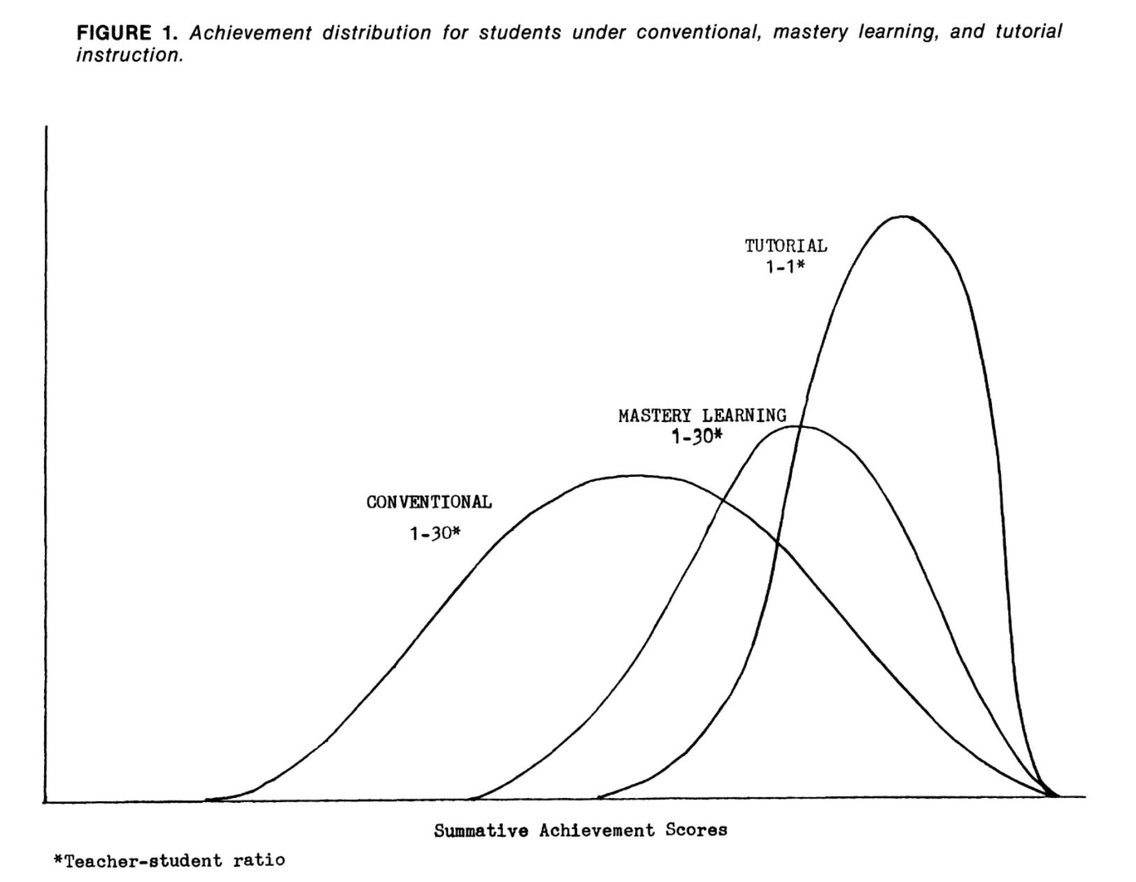 In the paper, Bloom compared conventional education, mastery learning, and tutorial instruction. While mastery learning led to measurable gains, 1:1 tutoring produced dramatically greater improvements.