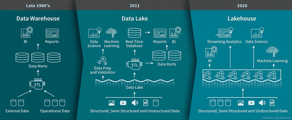Databricks’ journey: Databricks was founded the following year in 2013 by a group of computer science researchers at Berkeley. Their journey started as a data lake supporting open-source Apache Spark. Today, it has expanded into a broader platform that includes a Databricks marketplace incorporating data storage and positioning itself as a data lakehouse.