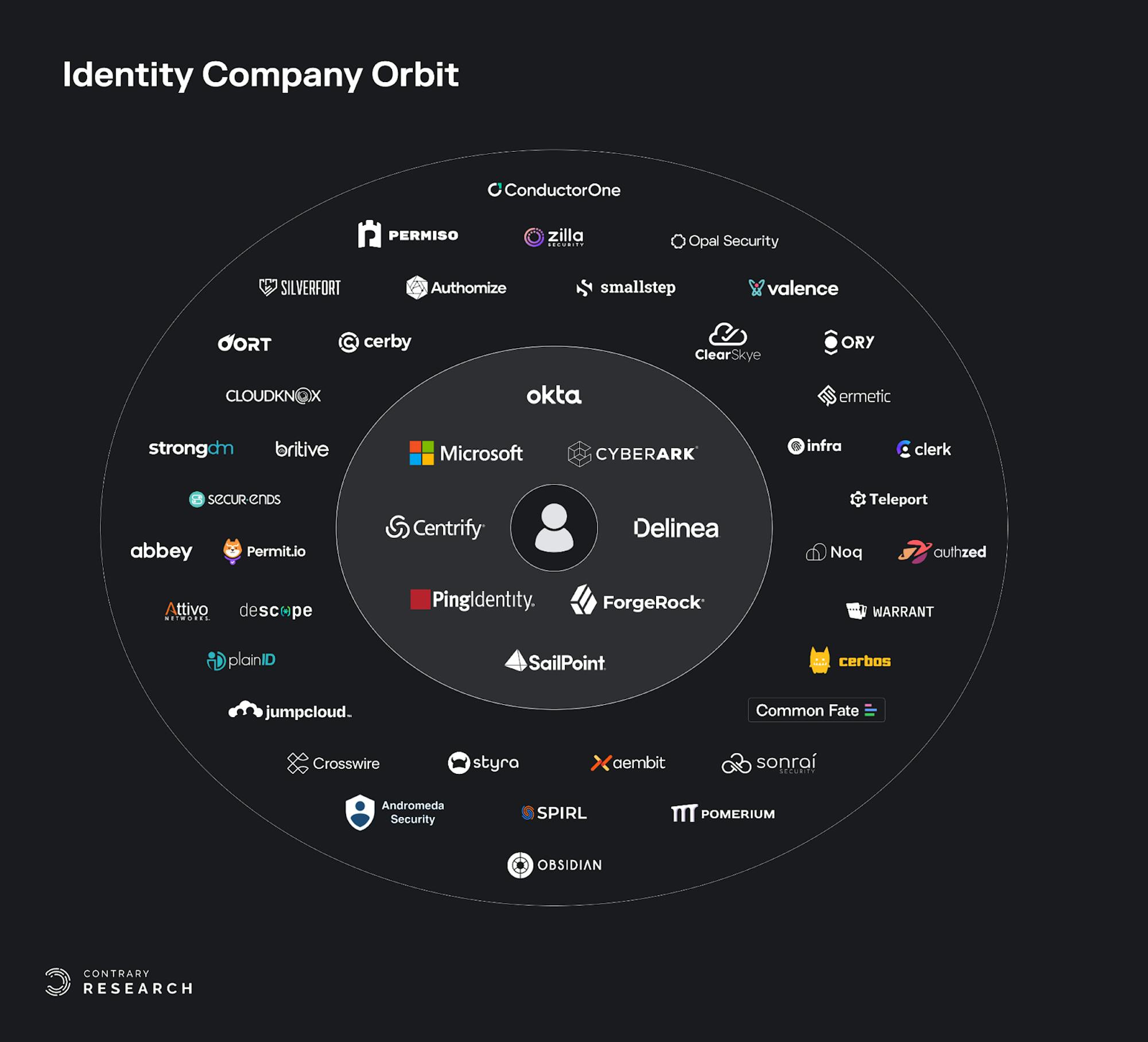 Currently, some of the most valuable standalone identity companies are Okta (founded in 2009), CyberArk (f. 1999), TPG-owned Delinea (Thycotic f. 1996 + Centrify f. 2004), Thoma Bravo-owned Ping Identity (f. 2002), and ForgeRock (f. 2010). Of all of these companies, only Okta was born in the cloud and has made progress towards converting the world to cloud directories, but didn’t meaningfully expand beyond that.