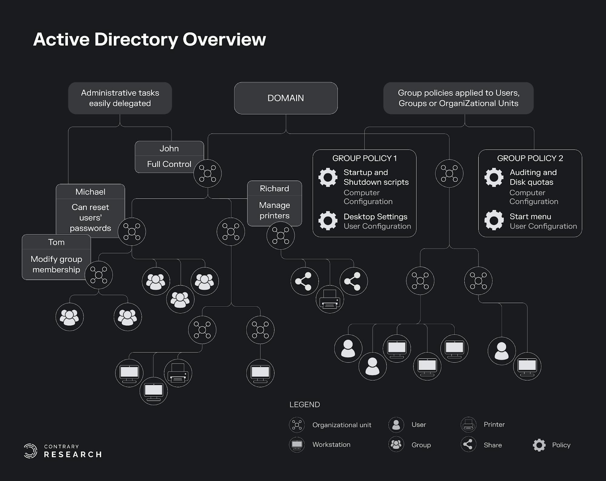 Meanwhile, in 1999, Microsoft previewed Active Directory, the product that would underpin Microsoft’s future in the enterprise and hammer the nail in the coffin for Novell. Active Directory (AD) was (and remains) essentially a database with business logic to service directory requests. AD structures can be objects (printers, servers, etc), principals (users, accounts, groups), or various permutations of objects and principals. Schemas are editable by admins, but every change is propagated throughout the system, leading to massive disruptions and changes when done improperly.