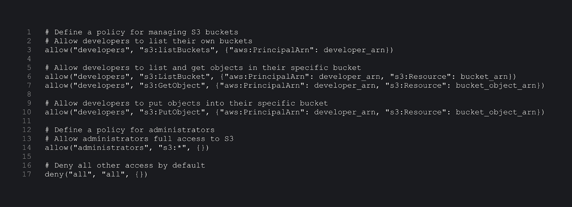 Let AI write IAM Policies: Whether policies are expressed in Rego, OPA, Polar, or something else, LLMs are particularly adept at learning new grammar and can express original authorization policies. We expect that IAM consoles will just integrate with LLMs to understand the context and intent of an enterprise identity fabric and generate IAM policies in concert with an administrator that makes sense for the company. For example, here’s ChatGPT creating a set of S3 access policies in Polar:
