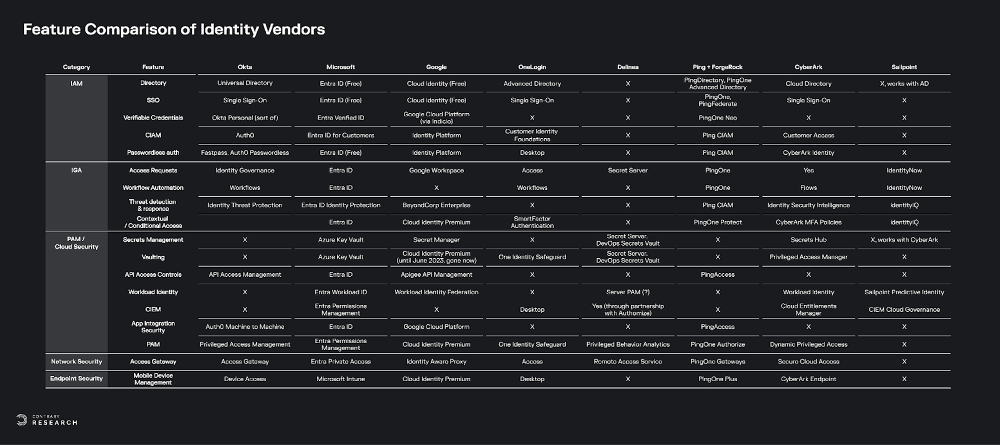 The problem for most startups is that it’s probably going to be Microsoft that builds this universal authorization layer, or even Google Cloud if they can successfully productize their security investments. If its not the hyperscalers, then Crowdstrike or SentinelOne have both signaled their interest in identity threat detection and response and have the data exhaust to power it. If not endpoint, then Wiz and Palo Alto Networks, which have both built out leading cloud security posture management businesses where well-configured access policy can solve many posture issues. If not CSPMs, then the SASE vendors like Zscaler and Netskope which already have robust private access businesses that are bleeding traditional VPN companies. Visit the Appendix below to see a feature comparison of the leading identity players.