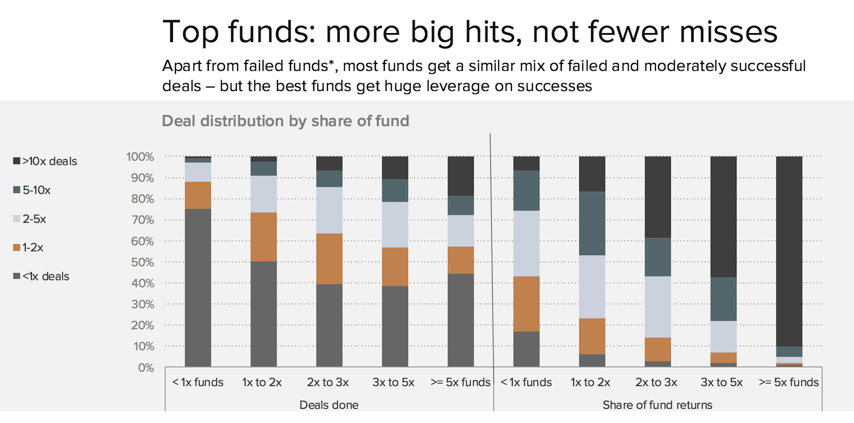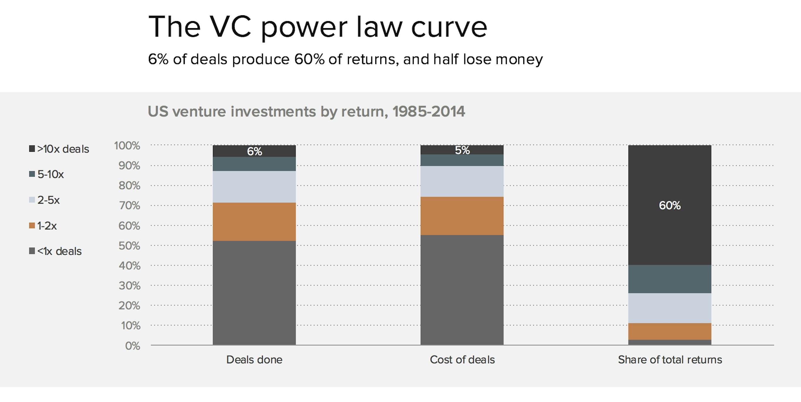 In 2008, Union Square Ventures founder Fred Wilson noted that “every really good venture fund…has had one or more investments that paid off so large that one deal single handedly returned the entire fund.” Wilson’s point was later echoed in 2016 by then-a16z partner Benedict Evans, who noted that in venture, “6% of deals produced at least a 10x return, and those returns made up 60% of total venture returns.”