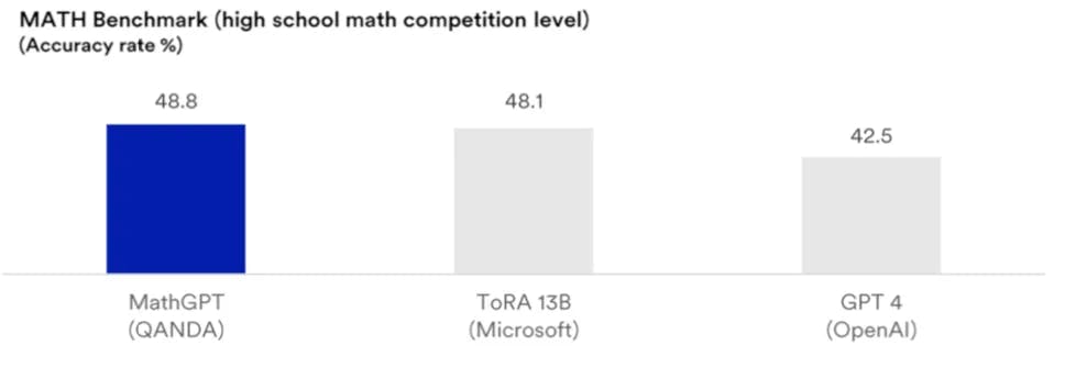 In January 2024, MathGPT outperformed Microsoft’s Tora, the previous record holder in math benchmarks such as MATH (high school math) and GSM8K (grade school math), achieving first place among models under 13 billion parameters.