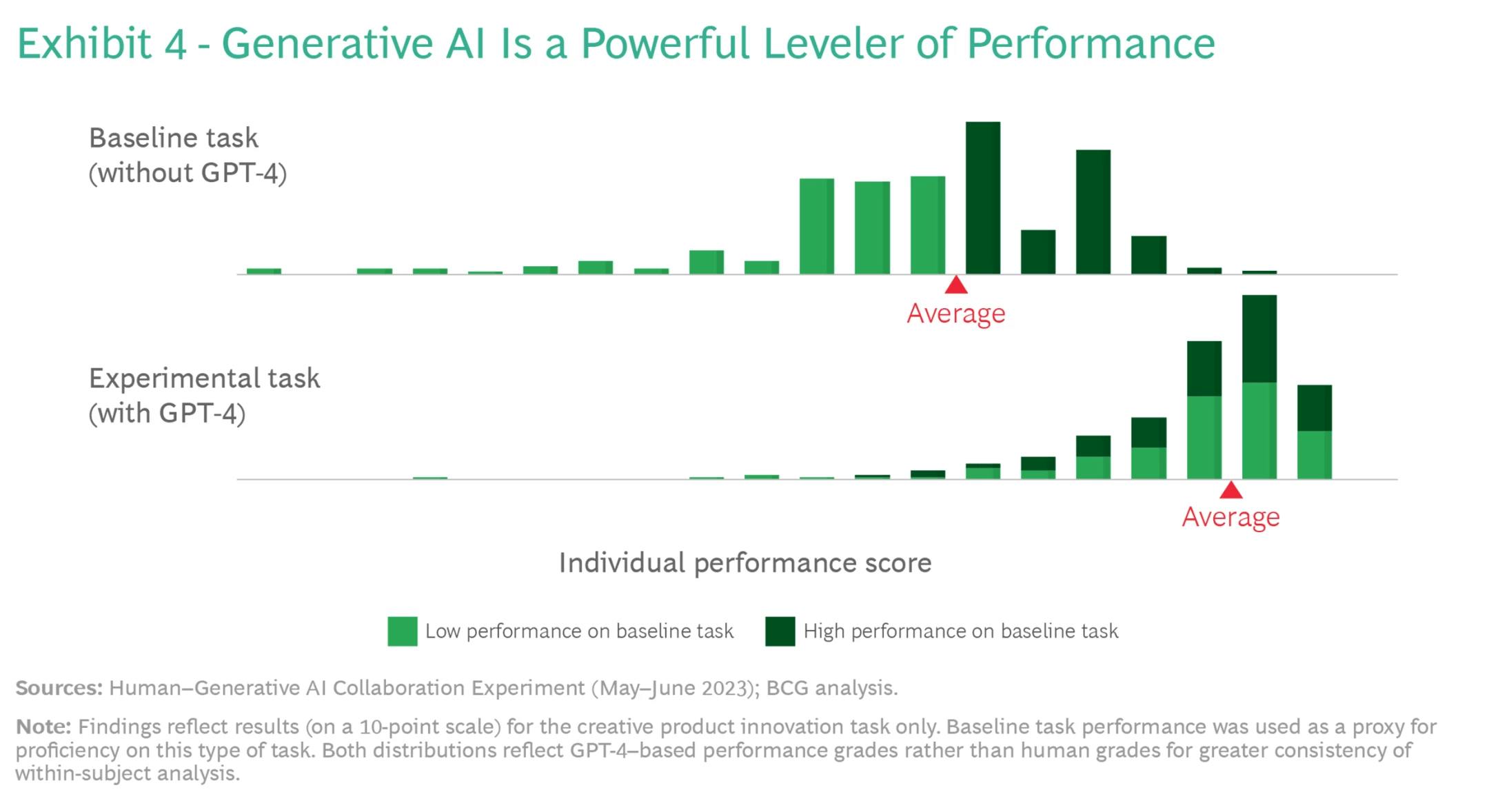 In September 2023, BCG published the results of an internal experiment in which 758 BCG consultants around the world were studied to test the impact of leveraging ChatGPT to solve different “creative product innovation” and “business problem solving” tasks. In this study, the consultants used a platform developed on OpenAI’s GPT-4 to enable similar capabilities to ChatGPT, and the results were impressive: while the performance of consultants using it for business problem-solving was 23% worse than the control group (according to BCG, this is likely because there’s more room for error when LLMs are asked to weigh nuanced qualitative and quantitative data to answer complex questions), 90% of participants showed improved performance on creative tasks, with an average performance boost of 40%.
