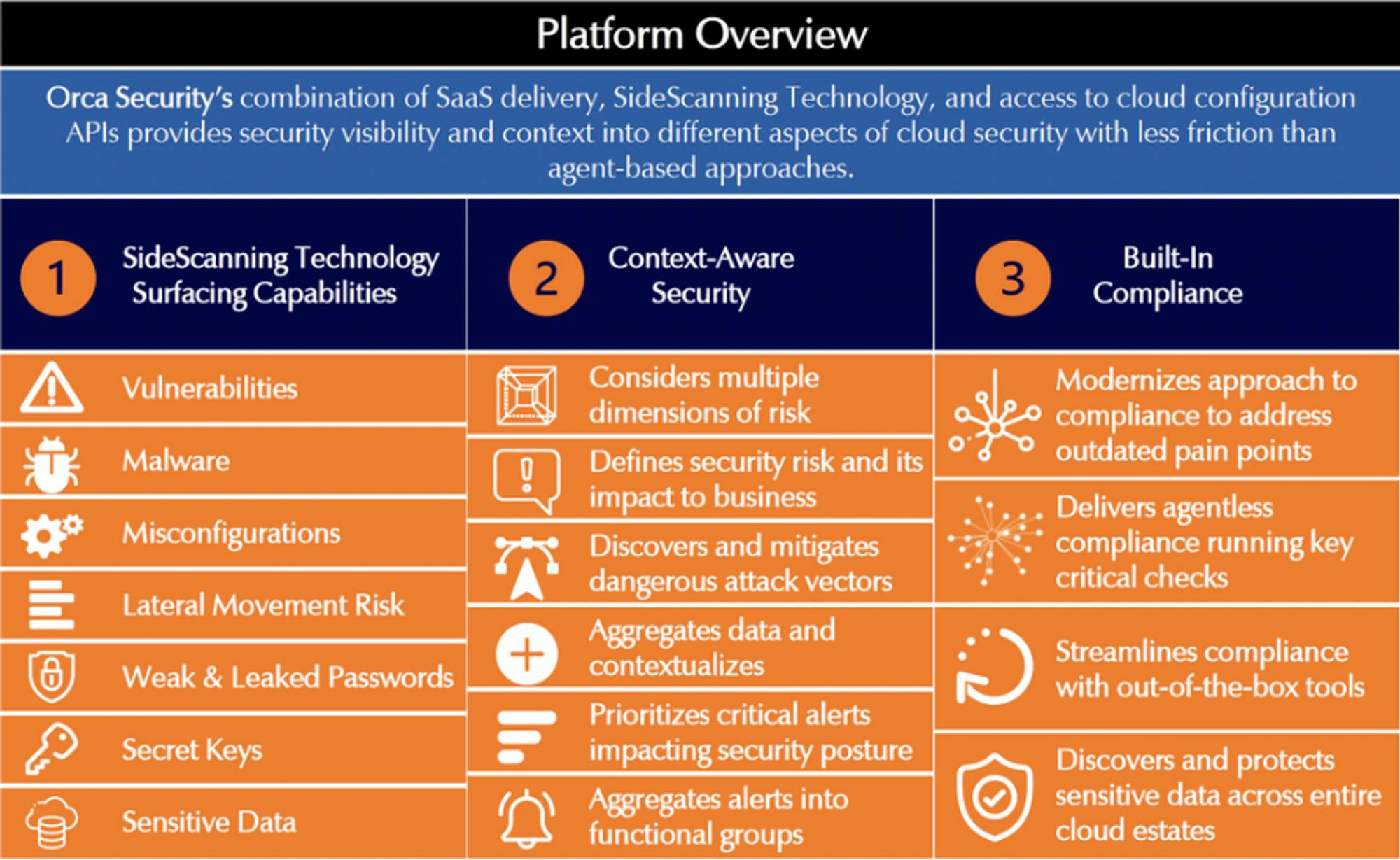 Orca Security provides an agentless CWPP that heavily leverages the cloud provider’s APIs. The company’s product leverages side-scanning technology that is able to simultaneously gain deep insights into cloud workloads and relevant metadata. Orca’s product doesn’t require an agent, instead creating a 1:1 replica of the cloud workload environment to provide greater context for risk alerts.