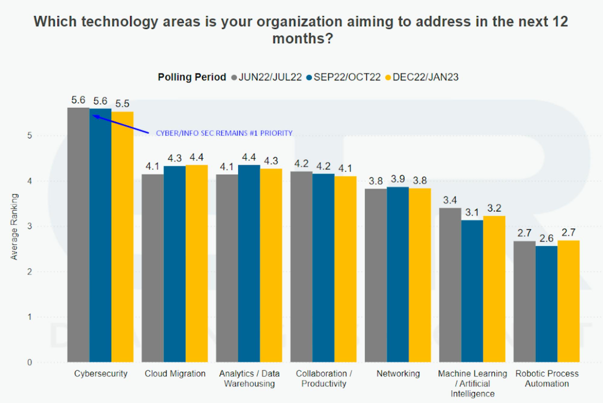 As we’ve discussed in previous reports, cybersecurity has become a priority for executives over the past three years. Going into 2023, security continues to remain an important focus followed closely by cloud migration.