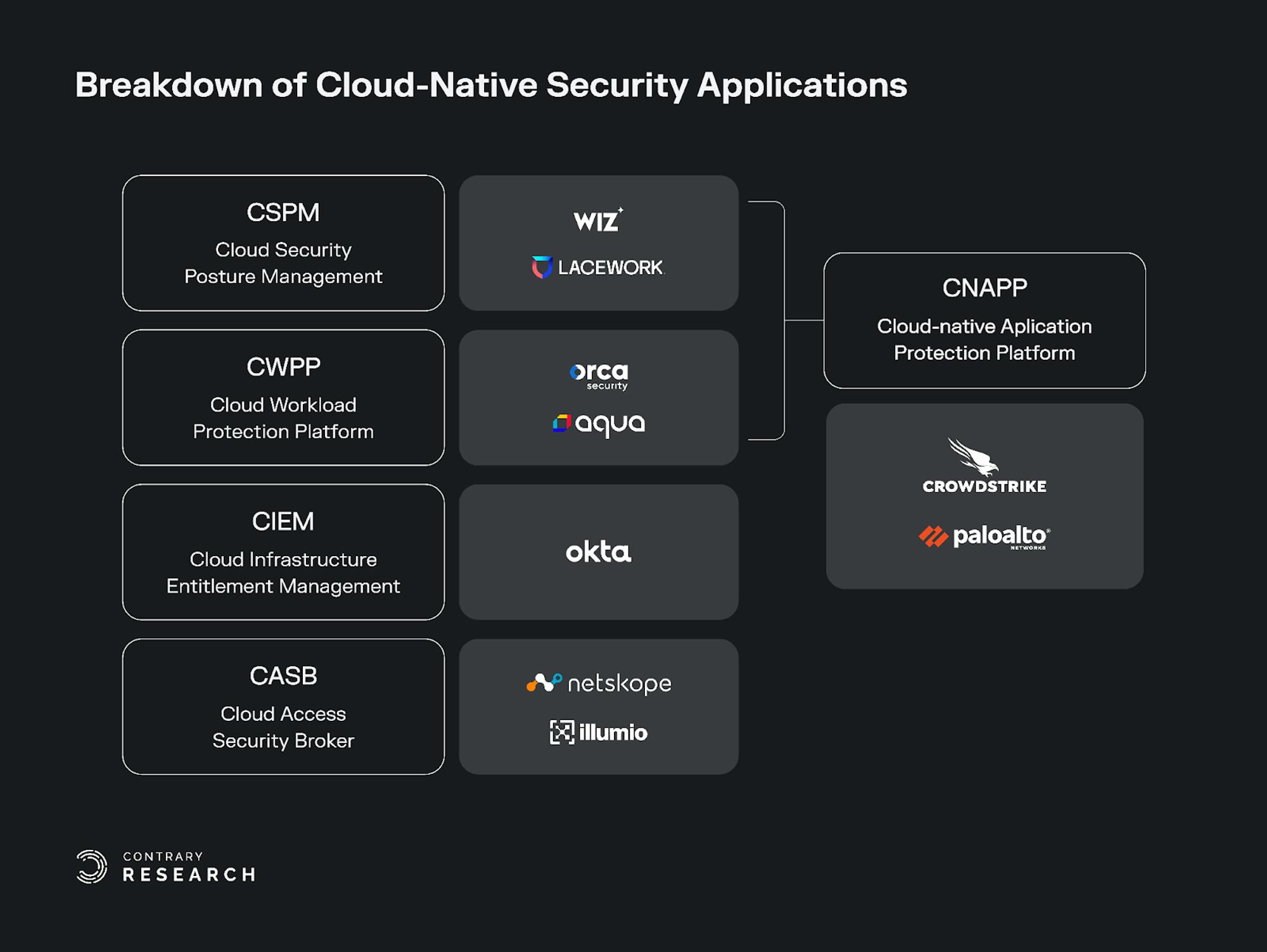 Below, we’ll outline these different segments and use relevant companies to illustrate these capabilities. But first, a caveat: one of the complexities of cybersecurity is the intricate overlap between different functionalities. As a result, while we may provide examples of CSPM with companies like Wiz, or examples of CWPP with companies like Orca Security, both of these companies would claim they have functionality that extends to multiple categories on the list beyond the one we think they exemplify.