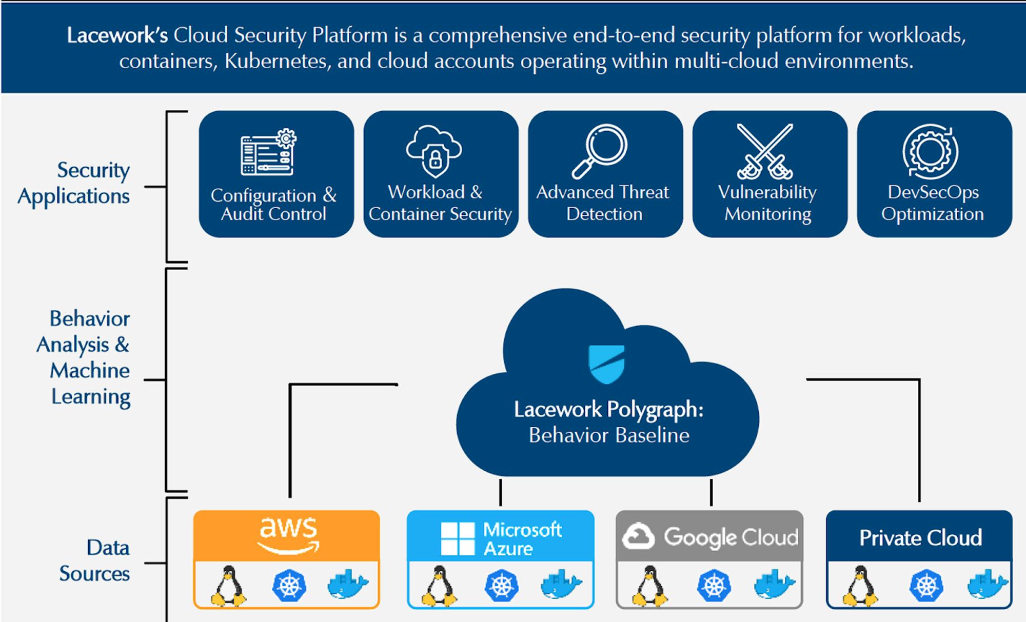 Lacework’s cloud-native platform offers automated anomaly detection that provides consistent visibility, context, and security across multi-cloud environments. It provides customers with the ability to detect attack activity stemming from known and unknown threats. Lacework created their Polygraph Data Platform which uses data and machine learning to automatically identify risks, vulnerabilities, and abnormalities across the cloud environment, and then surface high-value alerts, prioritize risk, and speed up investigations.