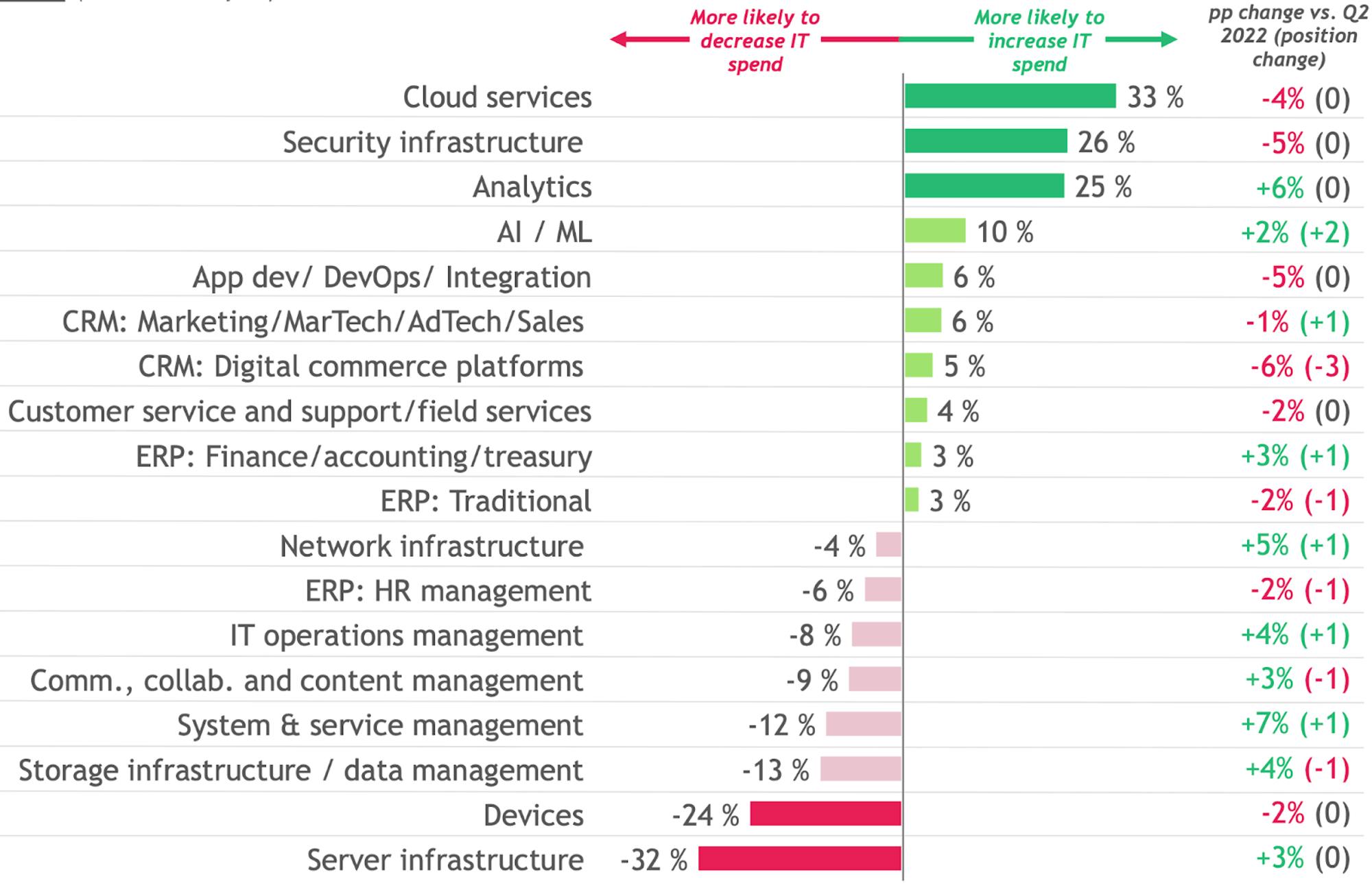 In a recent Gartner survey, cybersecurity was the top priority for new spending, with 66% of CIOs pointing to cyber and information security as their top area for increased investment in 2023. Similarly, a recent BCG analysis indicated that, while categories like server infrastructure and ERPs are seeing reduced spend, cloud services and security infrastructure are seeing budgets increased by 26-33%.