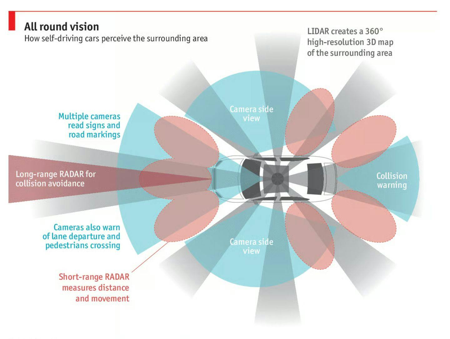 Lidar, a remote sensor that sends laser pulses in all directions to create a constantly updated 3D map of surroundings based on the delay between emitted pulses and their registered reflections.