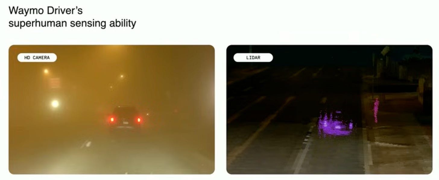 At Google I/O in May 2025, Waymo showed a few examples of its full suite of sensors successfully avoiding pedestrians in cases where it claimed a camera-only approach would have struggled. In one example, Waymo's lidar picked up the presence of a pedestrian in a Phoenix dust storm that was not visible on the camera.
