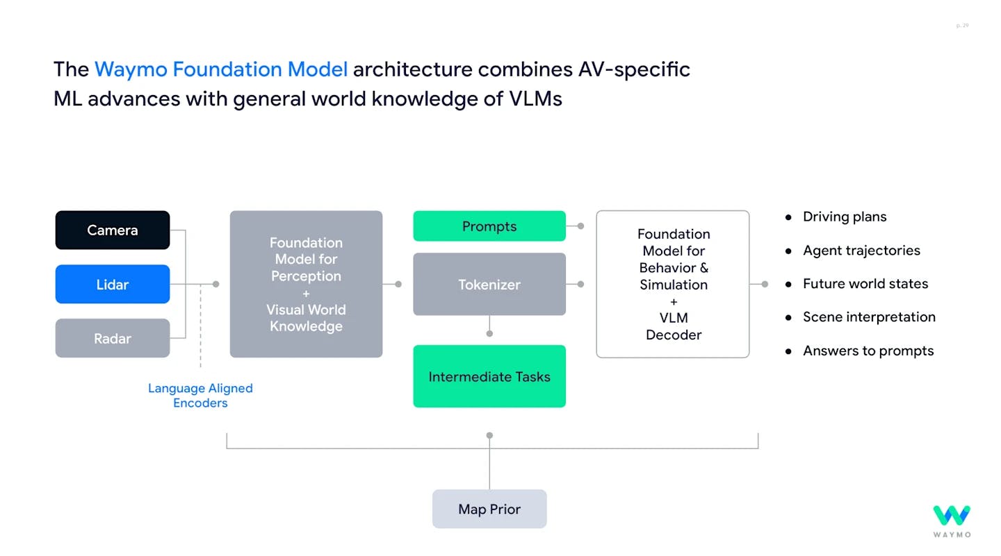 The AI model powering Waymo Driver is the Waymo Foundation Model, which is based on a combination of LLMs and VLMs (vision-language models). Waymo’s foundation model is a modular transformer-based neural network, meaning different models contribute to perception, prediction, decision-making, and control, with one model’s outputs acting as inputs to the next. While each constituent model in the complete Foundation Model is separately parametrized and calibrated, the decision-making process is flexible and not hard-coded, as some Waymo skeptics have claimed.