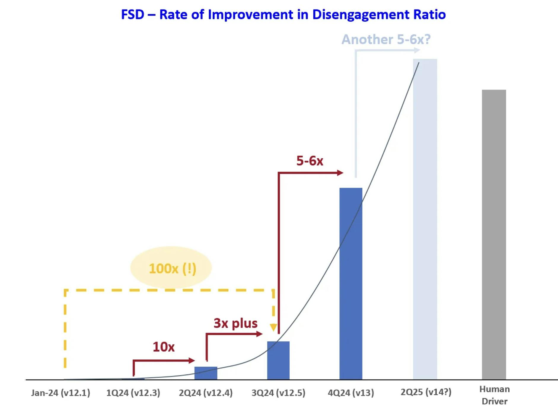 The new model seems to be working for Tesla. Since launching v12, Elon has claimed huge improvements in FSD’s disengagement ratio, or how often the human driver has to intervene and take back control. One unverified estimate in October 2024 put the improvement at 100x so far that year and projected a further improvement in the next quarter.